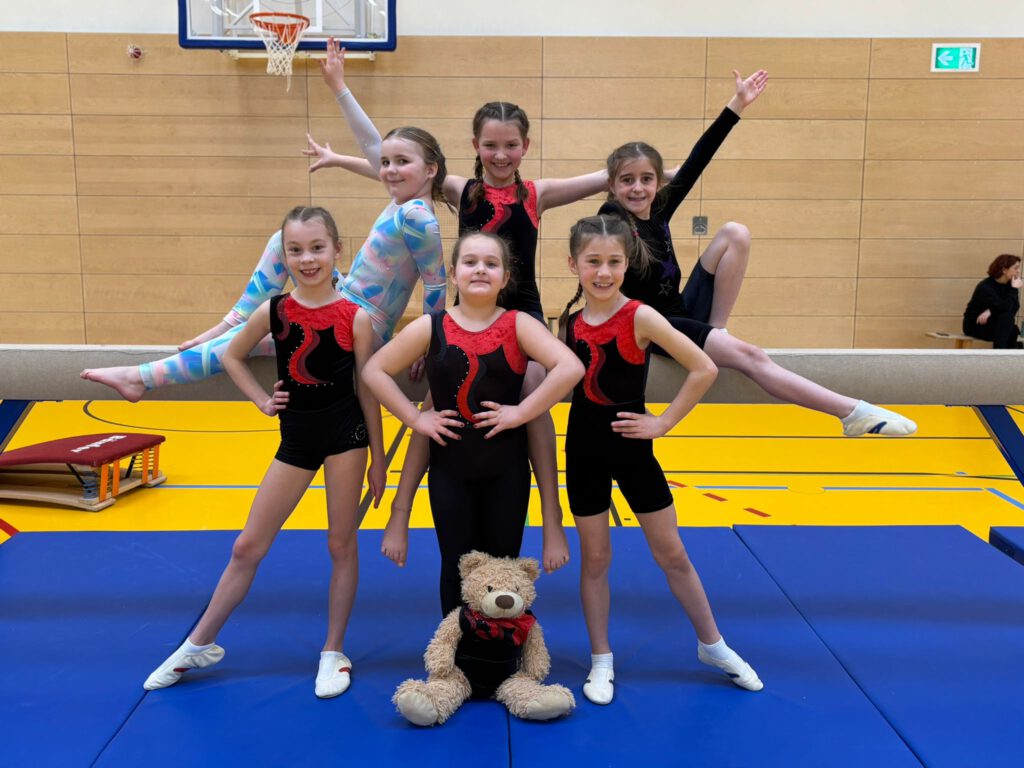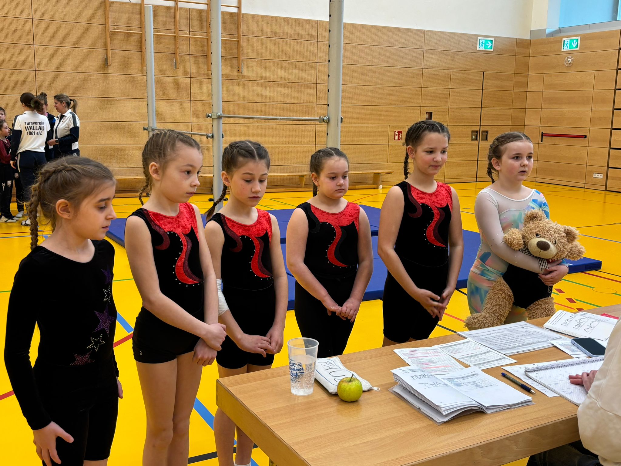 Am Sonntag, den 15. März um acht Uhr in Wallau versammelte sich eine besonders tapfere (und sichtbar müde) Gruppe der älteren Turnerinnen des Jahrgangs 2017 (Adelina, Felicia, Greta, Julia, Kaisa und Lisa) des Turnvereins Delkenheim.