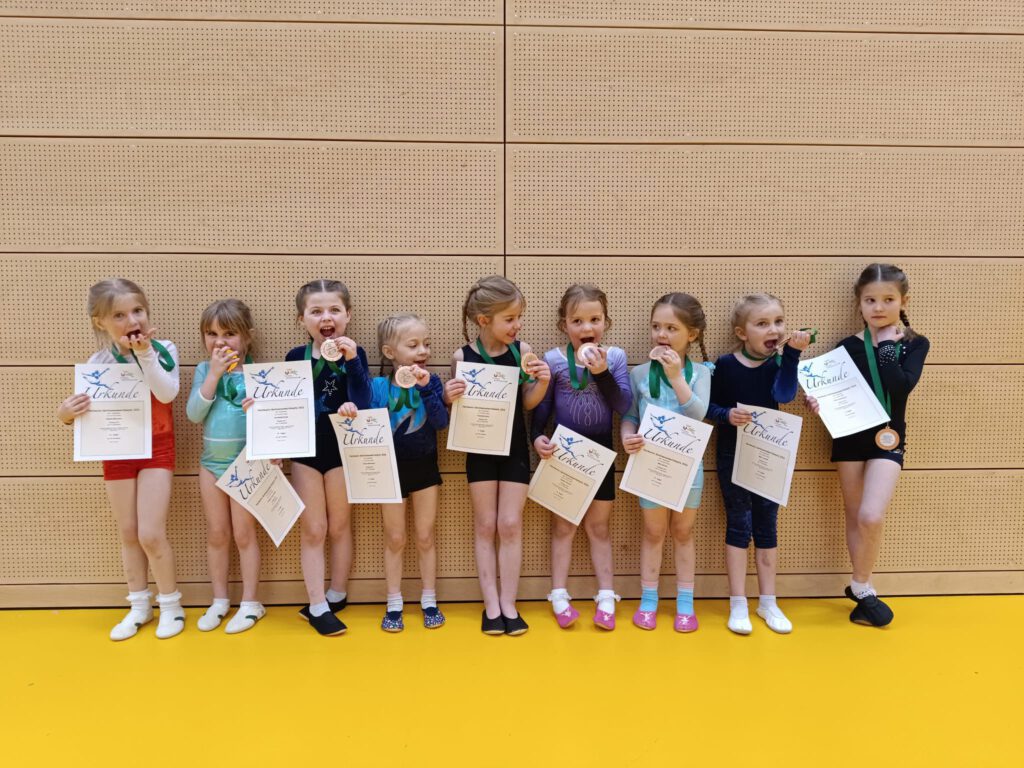 Mit Lampenfieber und farbenfrohen Turnanzügen starteten die ganz kleinen Nachwuchsturnerinnen der Jahrgänge 2020 und 2021 (Annabelle, Charlotte, Chiara, Emma, Ilayda, Mila L., Mila S., Paulina und Sophie) am Nachmittag in ihren ersten Wettkampf.
